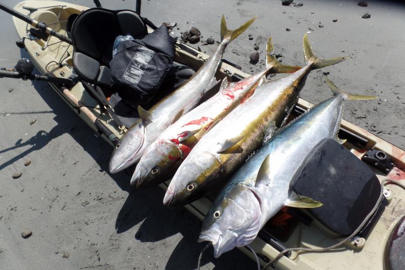 Not a bad day of fishing today. The quality yellowtail have been conspicuously absent for me for a few months. I have been getting one or two here and there but all in the 12 to 18 pound range. Today I really got into the nicer grade fish. Was planning on harvesting one today if I caught one, but they were so aggressive that 3 additional ones swallowed my offering and were bleeding profusely. I caught a total of 6. Released 2 and gave 3 away to some pangeros at the launch. I had a shot at a very large fish. Had him to the yak a couple times but could not land him. The jig was not visible so ultimately he abraded the line and it parted. Without a doubt a personal best. 50+