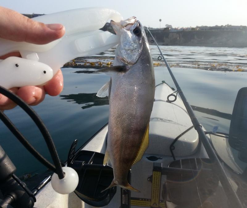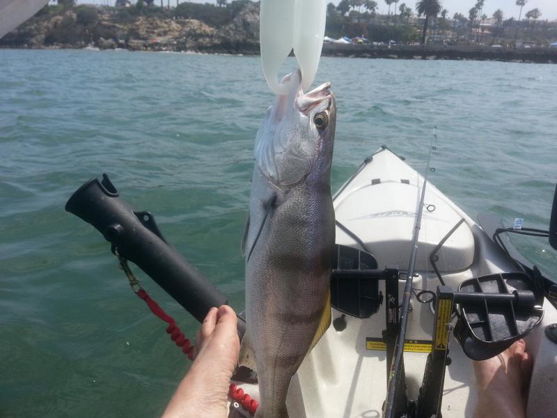 Made it on the water around 6:30 and went straight to bait barge. It was a beautiful morning... no fog, but a couple of rollers were working into the harbor. I got some bait and took off for Crystal Cove. Drifted for 3 hours with very little success. Caught a small sheephead and what I think was a small white sea bass. Came back in and fished around the barge for an hour with another guy in a blue yak. Caught a small calico and 5 more of what I believe are juvenile white sea bass. I am posting so if they are something else some one can let me know. Everything went back into the ocean. It was getting bumpy out there with traffic so out I went around 12:00pm.