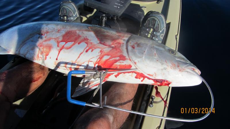All of the fish we cleaned has their stomachs plugged with these guys: Attachment 11202 These red crabs seemed to be around almost all of the time. They would range from seeing a couple swimming around the kayak. to massive 5 acre floats. There was one morning when they were particularly thick and you could hear the calicos slurping them off the surface. I was fishing with plastics one morning and hooked up with something big. I fought him for probably 10 minutes almost straight up and down. I figured it might be a grouper or black sea bass but when I got him to the surface it turned out to be a sea turtle about 3 1/2 ft diameter that I had snagged underneath his front leg. He would come up for one breath and then take off for the bottom again. He was simply unstoppable after a fresh breath. I wanted to get a picture but he would not cooperate so I cut him loose. I took an hour to explore the island a bit. Looked like the surface of the moon. Attachment 11203 Attachment 11204 Attachment 11205 We had an osprey land on a pole behind our cabin with his evening meal. He was still there working on it the next morning. Attachment 11206 OK you Baja travelers. Anyone recognize this place? Attachment 11207 Attachment 11208 The water was gin clear and one could see an amazing amount of life down to 30 ft. The one cast that I caught the 43 pounder, it hit fairly close to the yak, and there was another yellow of equal size literally fighting for the privilege of attacking my megabait. Me and my 37 Attachment 11209 Adam and his 38 Attachment 11212 Me and my 43 Attachment 11211 |