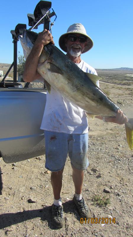 We spent the night in Guerrero Negro and had a leisurely 3 hour drive the next morning to reach Bahia Asuncion. Our hostess was Shari who we rented a cabin from in the city of San Rogue which is about 8 miles north of BA. Shari and her husband Juan are the unofficial Chamber of Commerce for this area of Baja. They are regular contributors on some of the other fishing and Baja Forums. Juan, among other things is a guide, and spends a great bit of time in his panga during the day. Shari, a native Canadian, moved to BA and met and married Juan and runs their 7 or 8 room hotel and their campground on the other end of town. Juan and Shari's home and hotel. Attachment 11191 We went out to our cabin in San Rogue and set up camp. Attachment 11192 I went on a bit of a recon trip and managed a couple calicos and a couple small halibut. Juan indicated the the better YT fishing would be around the San Rogue island so decided to beeline out there early the next morning. Attachment 11193 Turned out to be 2.45 miles from the launch to the closest point at the island. I was out there by around 6:15 and found Barries and Bonies stacked like cord wood and quality calicos pretty much everywhere, and a few yellows in the mix. For the day, I ended up with 20+ calicos, 10+ sandies,7 sheepies, 7 bonies, 6 yellows. Some assorted fish pictures: Attachment 11194 Attachment 11195 Attachment 11196 Attachment 11197 Attachment 11198 One yellow was noteworthy as it was my Personal Best. Just over 37 lbs on a spring scale. Attachment 11199 And so it went every day for the next 7 days. I spent most of my time fishing yellows but there was always bi-catch of calicos and barries and Bonies. The hot baits were the Megabaits and Scrambled egg irons. On the last day of fishing, I managed to get the 2nd PB of the trip. 43.4 lbs on the digital. Attachment 11200 I had an absolutely outstanding time. The company was great and the food.... You would not believe the meals that Jeff prepared for us using a 2 burner Coleman stove and some rudimentary utensils. When I travel down there alone, my evening meals consists of a Slim Jim and a Vitamin Water and maybe a fruit cup for desert. With Jeff around, it was like dining at a restaurant, or maybe like the food on a long range trip on the Excel. Nicely done Jeff. That's it for right now. I'll probably add some more stories later on but I need to unpack and clean my truck. |