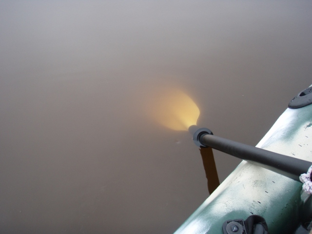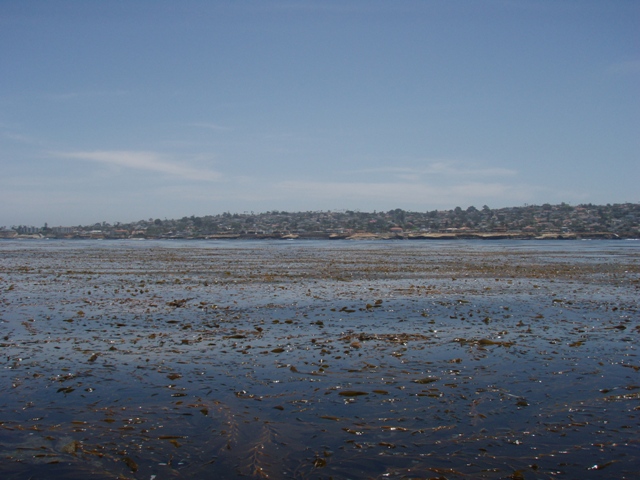 Decided to launch from Dog Beach and see how far south I could get in a few hours. Launched at about 5 and noticed a couple going for an early morning skinny-dip just down the beach from me. lolSurf was pretty friendly, only took one over the bow. Made a couple sardines and a handful of macs before my sabiki was tangled into an impressive snarl that was beyond my patience. Trolled those and some frozen squid all the way down along the drop off past Sunset Cliffs Park until I was about straight out from the Navy Fleet Training Center up on the hill for nothing but a couple of nibbled baits. As daylight set in I noticed a wicked red tide. :(