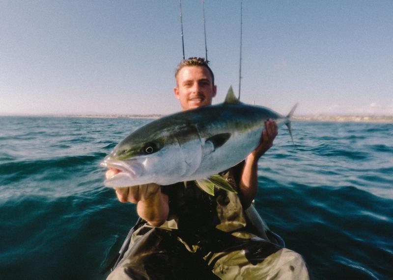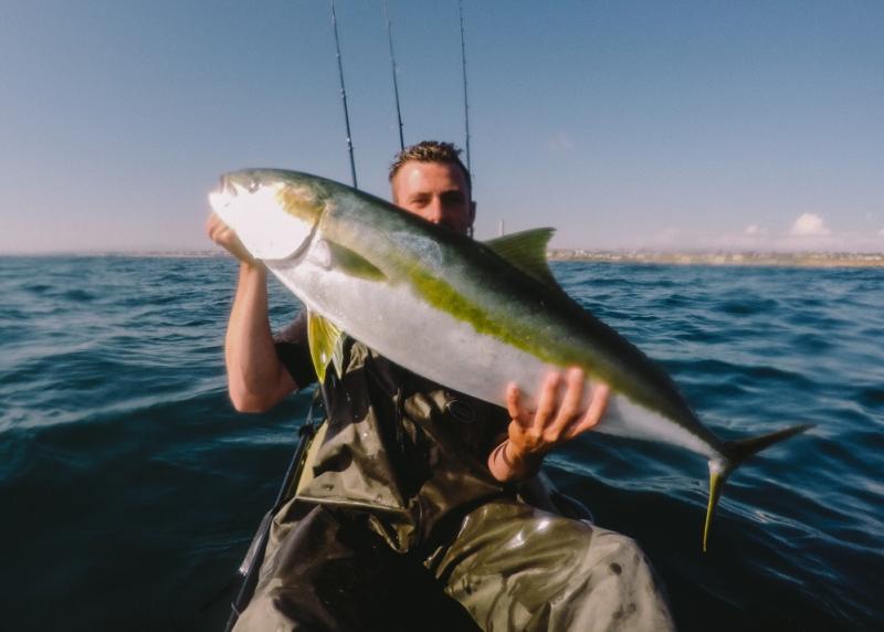Had one of those feelings in my gut telling me to fish today after work. Launched locally in some sketchy 3-4ft surf. Timed it almost right and ended up getting soaked on the first wave of a set. Lost my hat. Damn. Hauled ass to the local kelp with only a few hours of light left, got some greenbacks, threw one out and 10 minutes later I got hooked up. The local sportboat gave me words of encouragement as it pulled away, ended up getting it to the boat shortly after. Quick photo, then released. After so much time spent at this spot, and so many missed opportunities .... it felt damn nice to finally pull one up. The bait was really weird today and didn't want to swim so I just called it a day and headed in. On my way in I found my hat floating in the surfline ... great afternoon!