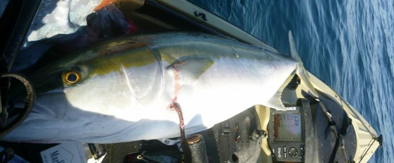 About an hour later I had another hookup and again landed a thick 41 pound yellowtail. This one slurped the jig so far into it's gullet that there was no chance of retrieving in. I harvested it with the hopes that someone at the launch would take it off my hands. That turned out to be not a problem. I even got my jig back after they cleaned it. They had a couple digital scales at the launch and was pleased to see the actual weight within a few ounces of taped calculations. This fish had a girth of close to 30 inches.