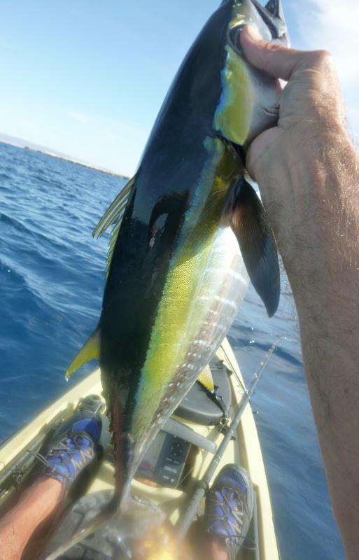 I left the beach at daybreak and a paddled to the closest point and started exploring the areas that had lobster buoys. Found an area that looked promising with a high spot of around 60 ft of water and dropping off fairly quickly to 120 ft. The high spot was covered with bait and calico and a good number of Sierra and pesky needlefish were in the area. About 8 i hooked up with a yellow on a jig in fairly shallow water and thankfully he mad a run for deeper water. Got him landed, taped and released. A very nice fat 38 pounder. About an hour later I hooked and landed another nice 35 pound fatty. These fish were built like offensive linemen. Massive head and shoulders. I then headed to the beach and was back at camp for breakfast at 10:30. Spent the rest of the day hiking and beach combing and of course the obligatory siesta. There were some cool looking cave formations in the surrounding Hills. My brain wanted me to try to get to them but my 68 year old body won the battle.