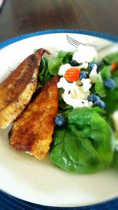 Cooked this in less than 10 minutes. Cajun lingcod one side blackened for taste. 3 minutes each side in olive oil...Mccormick cajun powder and a tiny dash of lawrys but not needed if you blacken. Spinach salad with blueberries and the dressing was just mezzetta Italian mix giardiniera vegetables with juice from the jar.