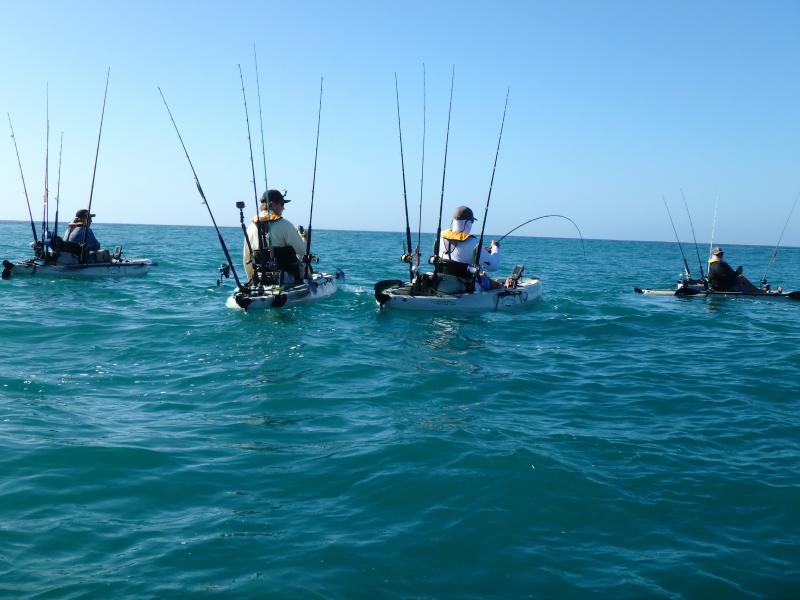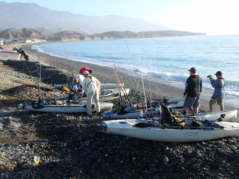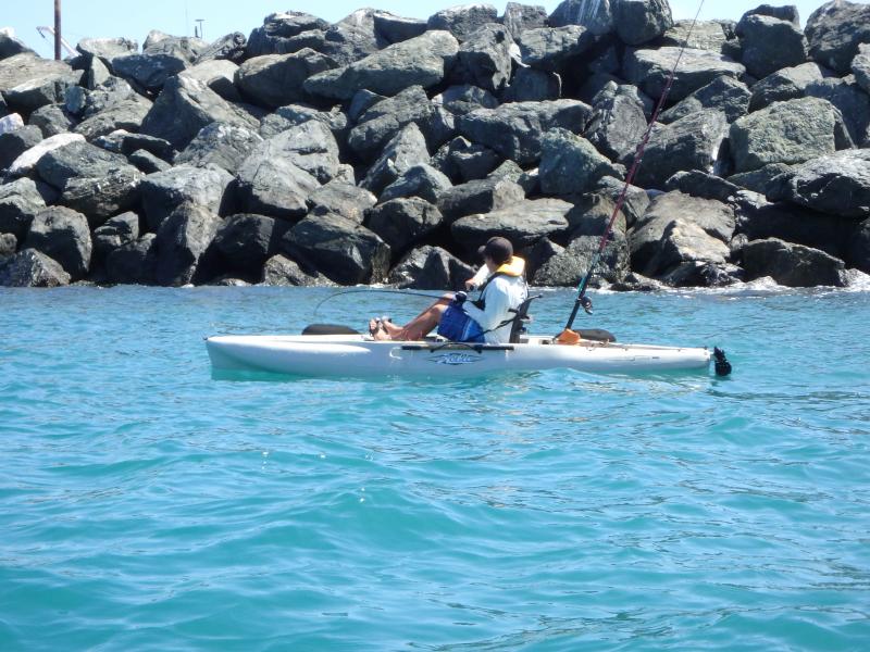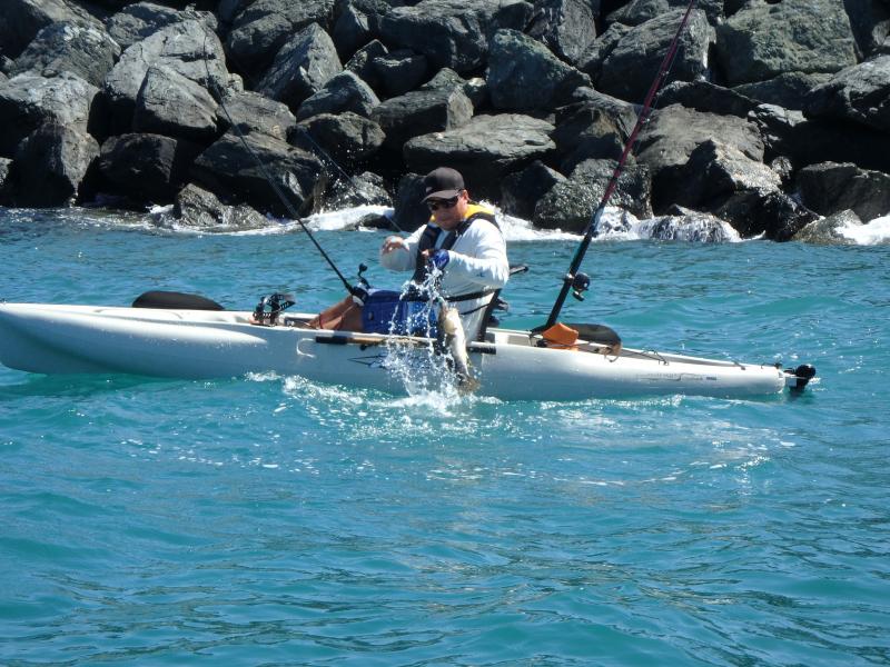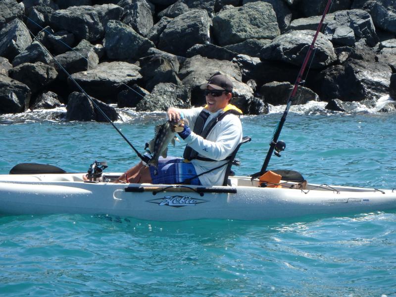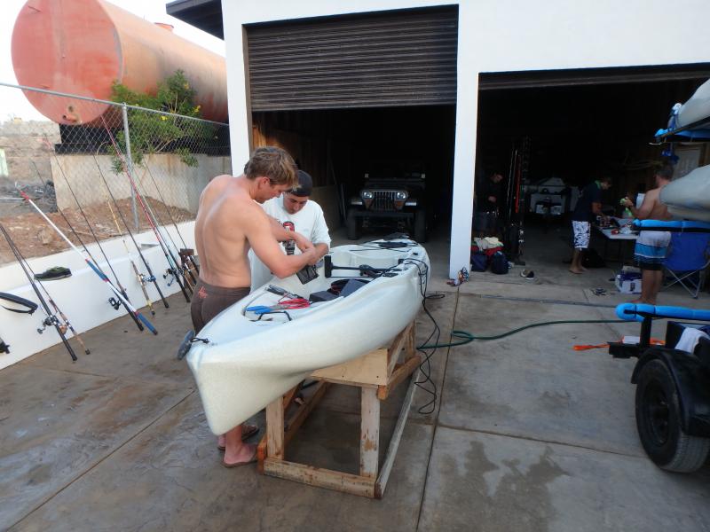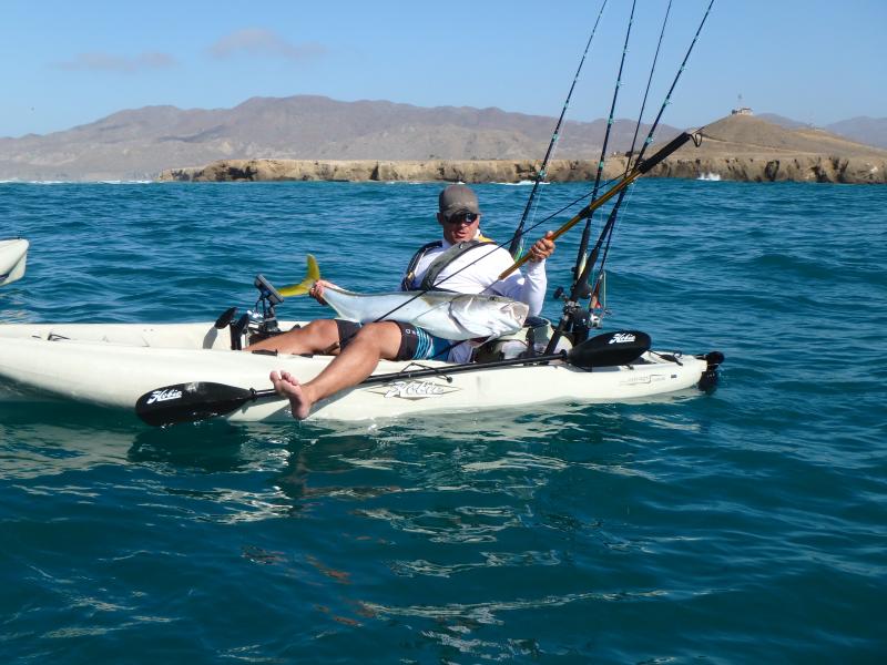 Sorry for the late report. Had back to back trips in June. Mid June was good to us and there was a lot of fish caught. We were lucky enough to be on the early flight and after a quick sashimi lunch we were fishing in the Hobie outbacks. Morgan immediately caught a nice Broomtail along the breakwall and Kevin followed up with a nice bass. Yours truly caught about a 12lb yellowtail that we kept for dinner. Once back at the pad the boys help rig the yaks with color fish finders and bait tanks.