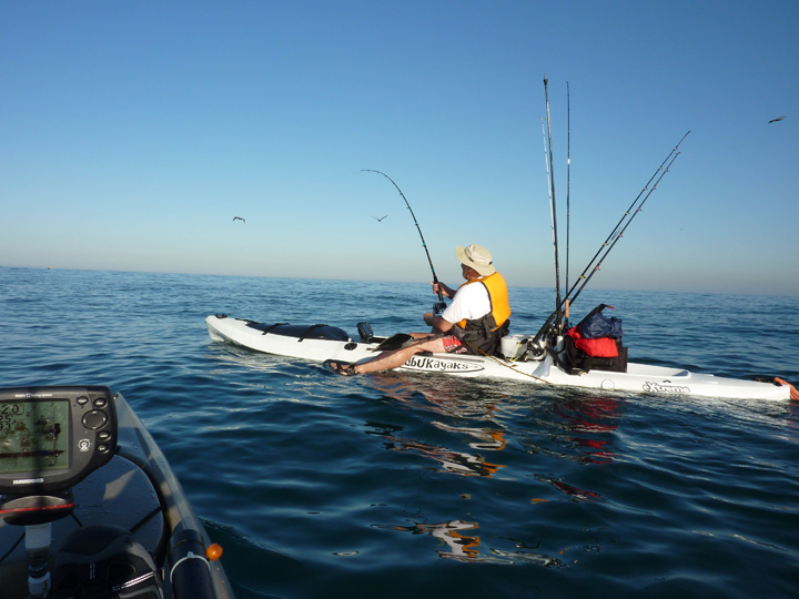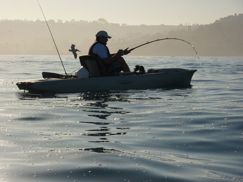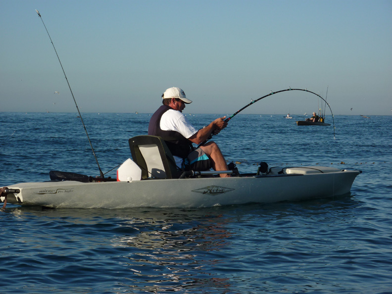 One of the good features about a Pro Angler is that there is lots of in-hull storage. Mike had everything secured below deck. His other rod had snagged on some kelp earlier and had already been handed off to his buddy so there was nothing in the cockpit to get tossed overboard... except for Mike. Bob |