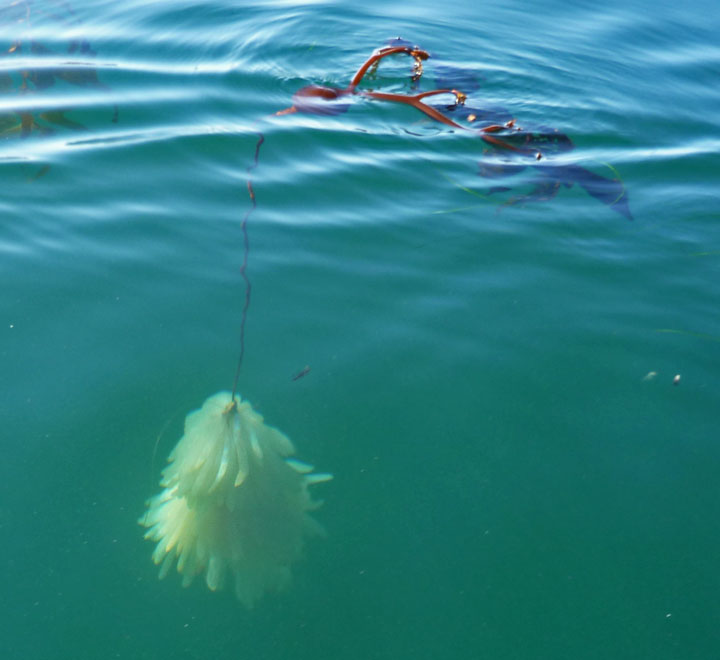 I only saw two other yakfishers out today. Jay was working the kelp with some sand bass success as I passed him by mid morning. A little while later, Ryan paddled in from somewhere over the horizon. He had been on the water since before dawn and, except for some bait had nothing to show for the day. Thanks for the squid Ryan. I did not have very high expectations for the fishing part of today's trip. My modest expectations were met. Bait was easy to catch but nothing else. I spent most of my day honing my squid catching skills. The freezer is now stocked. There were lots of birds, both in the air and on the water. A huge pod of small dolphins raced through the grounds a couple of times. The seals were hovering near by but did not give me any trouble. Unfortunately, I did not see any whales today. I think I caught my limit of squid eggs. While bouncing a mega bait off the bottom I alternated between snagging egg sacks and mackerel. Never anything bigger however. I did see one interesting thing. On my peddle out, I floated over a small piece of bull kelp with a cluster of squid eggs attached. This must have broken off near the bottom and floated to the surface. For those who have never seen squid eggs up close and personal, here you go. Supposedly we have another couple more days of this beautiful weather. I cannot offer much encouragement about the fishing prospects but if you just want to play tourist and enjoy a great day on the water, I highly recommend that you get out soon. Bob |