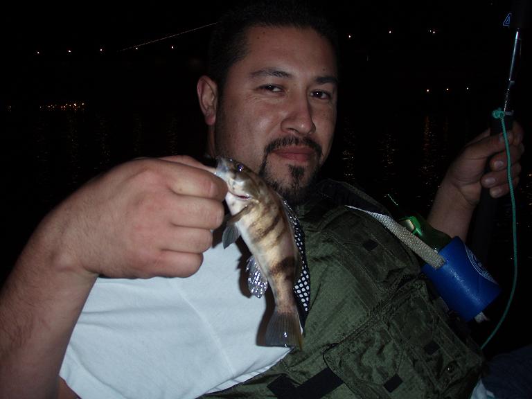 I showed him how to haul up the first net (nothing). He pulled up the second (nothing) and so it went for the evening but his excitement never diminished. We continued to drift and as I was about to drop a net after another unsuccessful pull he starts yelling “Hey Paul I think I got something.” I pulled along side of him to see that he had caught his first fish from a kayak (Sand Bass). Small as it was it was huge for him. Attachment 910