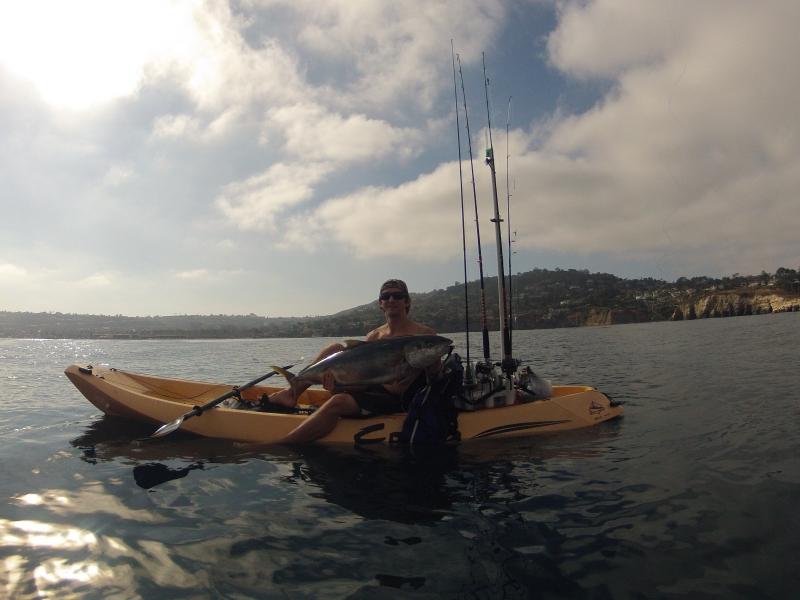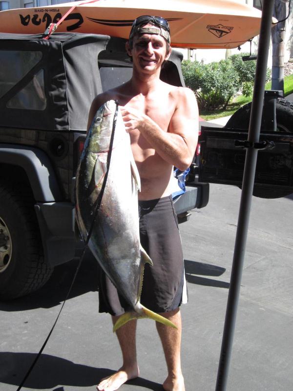 Had quite a thrill early Saturday morning out there. Launched early, fished for bait for about 1.5 hours, fished for yellowtail for about 3 minutes before this guy decided to play. Solid hookup, and he ran more than anything I have ever had on before. After one huge kelp tree, a few small stringers, and feeding the seadog dead bait to keep him busy while I gaffed, landed this beauty. Had to be around 35 lbs. Thank you to the guy who stopped to take the pic for me.Attachment 6893