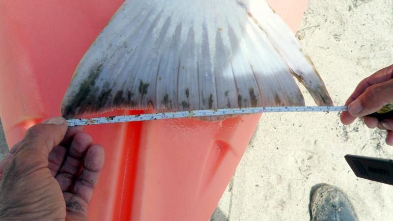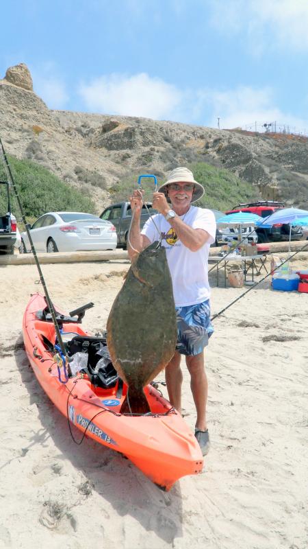GF and I decided to spend the day at San O on Sunday. I worked an area just outside the surf line which had a little depression going from 12 to 18 feet. I had some fresh dead with me but nothing showed any any interest in them, except a 5 ft leopard. I worked the area for a couple hours with a 1/2 oz jig head tipped with a Gulp Nuclear Chicken curly tailed grub. Had a nice pick on small sandies and calicos, but also got 5 smalibuts, so I knew momma was in the area. I finally nailed her around 11:00 am. Attachment 7160 She was 44" long and pegged my 40lb spring scale. It's a new PB by over 10 lbs. Attachment 7161 |