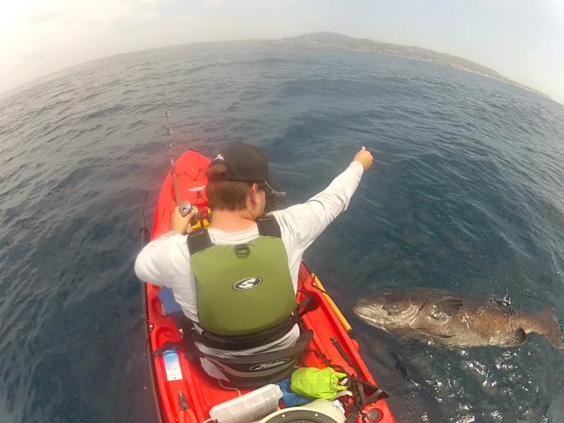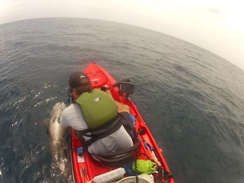 Out of greenies, I hook the only spanish I kept and begin trolling back in, less then 3 minutes later the reel is dumping line, put the reel in gear and were off. I spend the next 20 minutes getting the fish out of the kelp, its making large runs, but no headshakes.... but I'm still hoping its a YT. 40 Minutes into the fight and finally I see color, but its dark and much larger then I anticipated. Shark? Then I see the tail, nope its a BSB. Another 20 minutes of tug of war and the fish is done. Hook removed and 5 minutes of revival and she is ready to rejoin her friends down below again.