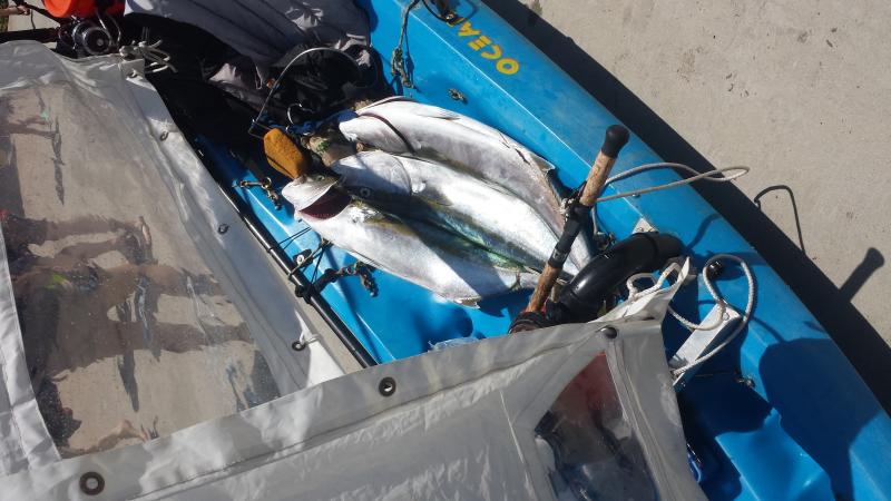 Went out a 5am. Had a few problems with buddy's rudder on launch. Nice guy had a extra one and saved our trip. Went out just shirt of kelp made bait. Mostly Spanish and small 5 inch ones. Not stoked on bait we trolled wnw away from kelp out a couple thousand yards then followed parallel to kelp. Fishing was amazing. Five min then the first one hit. Get him in and my buddy's goes off. I bait up again. He got his. Troll w again for no more than 5 min my buddy gets another hit. This one was lost but then mine went off again. It was like this for about 2 hours before we decided to head in. In total I got 3 on the yak and he got 3 missed 2. We left because I had to work lame. They were showing no signs of slowing down. On way back in I picked up my 4th. What a day. Two over 30 lbs 43" & 45" one 26lb and one 15 to 20.