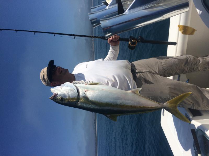 After 5 months of unsuccessfully stalking yellowtail from my yak, I broke down and took a charter to learn some tricks of the trade. Jimmy Decker didn't disappoint. I caught this one in about forty ft. of water slow trolling a flylined greenie, just south of San Clemente. I'm 6'2" and weigh 230 lbs. Jimmy didn't have a measuring tape or a scale. Any guesses on length and weight?