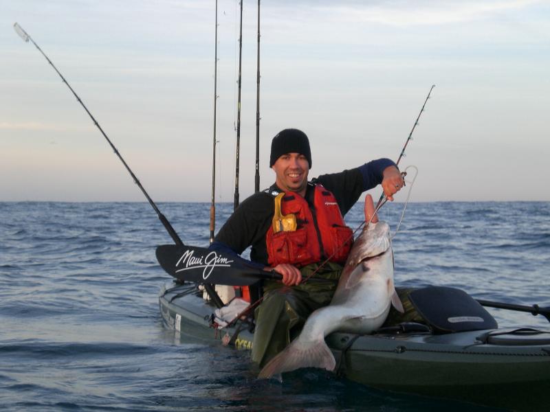 Finally got a window to go out this last Monday. I showed up to the launch at 5:10 AM and I was the only person there. I thought to myself, "am I at the right place, this is La Jolla right?". 5 minutes later Billy V. drives up. We chat for awhile I decide not to wait for him because he has to go to the head and am geeking to go fishing. I made it out dry with some nice sneaker sets. The swell was pretty big. I get out to my spot and throw down a glow in the dark with squid on it and toss it into the rod holder. A drifted for for about 10 minutes while Yo-Yoing for nothing. There was really good signs of bait so I thought I would stay in that spot for awhile. 5 minutes later a big pod of porpoise come charging through and go right under my boat. The bait must of spooked because it was a desert under me. I winded up my lines and made a short paddle to deeper water. I came across another bait school so I dropped down the glow in the dark and began yo-yoing again. About 30 minutes into my fishing session, I see 3 big marks under the bait so I dropped down the Salas 6xJr...boom hits the bottom...3 cranks...boom, fish on! At first I thought it was a Sand Bass because it hit so softly, then zzzzzzzzzzz:reel:. I knew right away after that it was the right kind. I took my time loosened the drag a little because WSB have soft mouths and I was using 20lb. mono. The fish fought nice for several minutes until it hit about 60 feet of water and then gave up. Couldn't believe my eyes, it was an absolute SLUG, by far the biggest WSB I have ever laid my eyes on. I gaffed it gently right below the gills and game clipped her. Un-F#&%-believable! Thanks for the picture Billy...made it back to the launch by 7:00 AM...So Stoked!