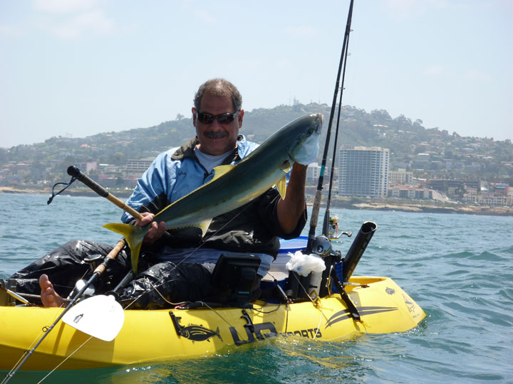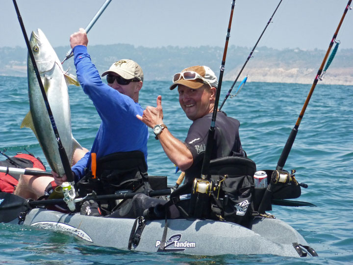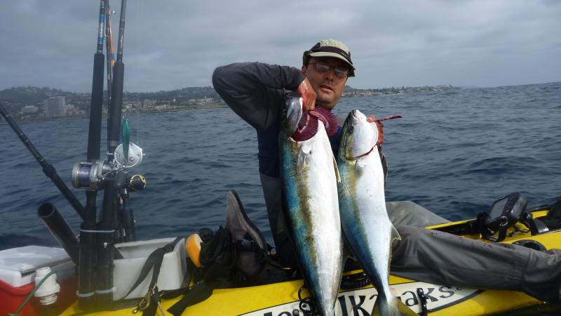 Since I am telling the story, the narrator will be me, sometimes known as Bob. The story needs a handsome Mediterranean guy so I will call him Yani. Other characters include Dave, sometimes known as Driftwood and a couple newbies I will call the Ryan Brothers. Remember, this is a totally fictional tale but to make the reading interesting, I have included some photos that may have been enhanced with a few Photoshop techniques... maybe not. So here is the story. I have not been very successful on my last few fishing adventures. My wife was having her book club over for lunch today and I was told to make myself scarce. Going fishing seemed like the appropriate thing to do so after I took care of the morning’s important business stuff, I headed to the launch. I did not get on the water until after 9:00 and the place was empty. I saw one recently landed kayak that had blood on the deck but otherwise no evidence of fish. The owner was nowhere to be found so I geared up and headed out, looking forward to the day’s adventure. The launch was easy but I quickly noticed that the Red Tide had taken a firm hold on the area. As I peddled out, it got worse. It looked like I was traveling down the muddy Mississippi. Most of the kelp had been swallowed up by the Red Tide so I kept peddling west. At about 85 feet, the water cleared and became that beautiful blue-green color that we know often holds some fish. I began to make bait. The bait was small and a mixture of greenbacks and Spanish but they looked healthy so I filled my tank. Just as I unhooked my last bait and dropped it into the tank, the water around me exploded. Others have told me about this but I had never experienced it in person. I was in a football field size feeding frenzy. Dozens, probably hundreds of Yellowtail were crashing bait on all sides of me. I had not yet put bait in the water so I grabbed my jig stick and let the iron fly. Within seconds, on my first cast, I was hooked up. This was my first fish on a surface iron. The fish was pissed and immediately headed for the kelp. I tried to peddle out of range but the fish had other ideas. I fought the tough fight for about ten minutes but the fish made it to the kelp and got good and stuck. My jig setup has mono. I could not hope to rely on the kelp cutting capability of Spectra so I tried something else. I pulled on the fish close to the breaking point of the line and then let up. When I did, the fish started to swim away. I reeled the slack back in only to be stuck again. I repeated this technique for about half an hour until suddenly I saw color. The fish was spent so I gently reeled him to my yak. I know it was a dumb move but for some reason, I did not want to stick this beautiful tired fish with the gaff. I reached for the gills, planning to just lift the fish onboard. Bad decision. When the fish felt my touch he pulled away and the hook came free. As this beauty swam slowly away, I thought of how to spin this event so I would not look like a dufus. Catch and Release! That’s what I did. And when I got home, I hugged a tree. Well, at least I had bait. I pinned one on and started trolling. Since I was supposed to be working, I decided to take a few minutes to check my messages and return some phone calls. I was about to leave a message for some customer who had called in when my reel started screaming. I mean really screaming… louder and faster than I had ever experienced before. I hung up mid-message and started working the fish. This guy was really moving. I had a sleigh ride like never before. The good news was that I was far from the kelp and this fish was hooked on my 65 lb spectra setup. I could wait him out. Eventually, I landed this fish without incident. Now what? My Revo does not have many places to store a fish. The best place is in the stern behind the bait tank but there is no way I could strap a fish down by myself without flipping the kayak. I scanned the horizon and saw a couple of guys about a half mile away. I peddled over to one of the yaks and recognized Yani. With his help, my fish was securely bungeed to my yak. Yani and his fishing partner for the day Dave, had not had any luck so far. Maybe I was the good luck charm or maybe it was just time for these guys to get some love but within a few minutes of joining these guys, Dave hooked up. It was a nice YT, about the size of mine, (18 lbs). As Yani and I congratulated Dave on his great fishing skills, Yani hooked up as well. It was another 18 pounder but according to Yani, it fought like something much bigger. Attachment 2285 Attachment 2286 And so the day went. Nearly everyone I saw on the water this day had a fish. It was getting late and my wife’s book club meeting was over so I prepared to head in. Just then I saw a couple of guys in a tandem hooked up. I peddled over to see what was going on and got there just as they gaffed another nice YT. These were the Ryan brothers, whom I had not met before. One brother had caught a Yellowtail earlier in the day. This fish was caught by the other brother. Both fish were firsts for these guys from a kayak. Now the story gets a bit weird. As I circled their yak snapping photos of their trophy, the boys were nearly overcome with joy, high fiving and snapping photos of their latest catch. It was a great moment. And then it happened. Attachment 2287 Attachment 2288 I watched it happen and am still not quite sure what caused it. Within a few seconds of the last photo that I took, their kayak was upside down. Everyone and everything was in the water. I peddled over as quickly as I could and grabbed whatever I could find floating. Unfortunately, the only things floating, other than the brothers were some empty beer cans. When I met the guys on the beach they told me that they had tallied up their equipment losses for the day. Five rods and reels, a bunch of tackle a camera and who knows what else. The total came to about $2000. They even lost the beautiful fish that 