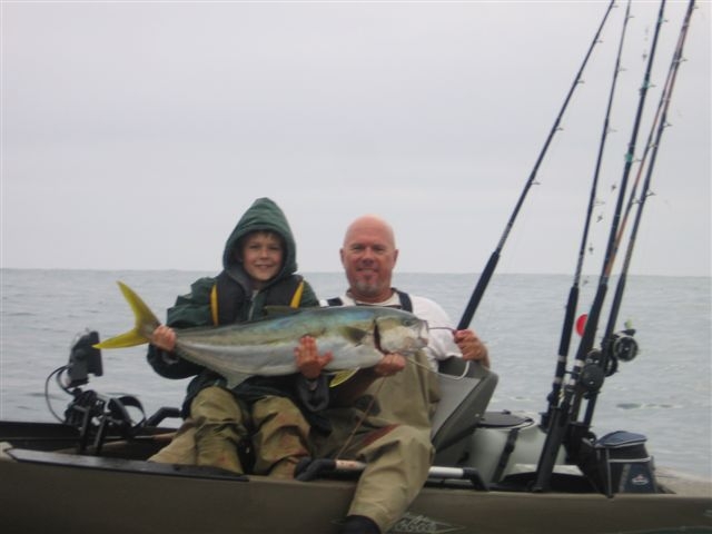 Chilly and overcast this am in LJ with just a few yaks on the water. It sounds like the wild action may be over for now. June started out a bit slow but I did get into the Canyon Party with a 39 lb. WSB on an iron on 6/18. Last week my son came into the office with me on Friday and we headed out to sea after the close of the market. Getting out thru the surf was no problem but coming in as the swell picked-up was quite another affair. I had to back paddle over a few waves before I was lucky enough to find a bit of a lull to get in without rolling. Lucas had tears of fear in his eyes but afterward he told my wife that he was not afraid at all. We high fived after both landings. The Yellowtail weighed only 21 pounds, 36" but it fought like a 30 pounder after it hit a trolled Mackerel so the old techniques are still in style.