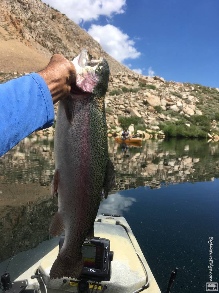 We moved camp to a lower elevation to thaw out for the second part of the trip, and we fished Lake Crowley and Convict Lake. According to the GPS, we covered 7 to 8 miles trolling around Crowley, which was a good day for us newbies. Special regulations are in effect at Crowley; barbless hooks, 2 fish limit, 18" minimum size limit. We picked up a few shorts that measured about 15", but had a blast regardless. Fishing remained slow at Convict, but the enjoyment of fishing from the yak remained high.