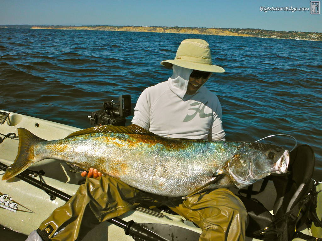 Personally, I read everything I can find, but sometimes that just doesn't cut it. Before I begin, I will tell you that I'm very new to this sport. I'd just like to share my story like many of you have before. The story of an angler who's found kayak fishing, read everything ever written on the subject and spent thousands of dollars in the process. A guy who's also found catching fish to be quite the challenge. It's not easy and as a matter of fact is really hard! The big fish that originally make us rush out and buy all this stuff aren't exactly dumb. Fortunately I was steered in the right direction over time through this very site. So reading about kayak fishing during all hours of the night kind of paid off. It all started with an e-mail exchange with a well-known, local fishing expert named Josh Pruitt aka THE DARKHOURSE. I’ve been in contact with him since last fall when I purchased my brand new Hobie Oasis. From that point forward, he had been giving me great advice. Everything from what gear to purchase (rods, reels, sonar, tackle, etc) to what would be essential to landing trophy fish. While I was making the time to get out on my own the results just didn't follow. So I had no problem swallowing the pride and hiring a professional. I want to catch fish! Josh and I met up for the first time on a cold Winter day. Being that it was cold I really wasn't expecting much. Summer is the best time for Yellowtail right? Then Josh hooked me up on fish after fish dropping the yo yo iron. I was hooking up, but with my “rookie status” I didn’t land any. Not one! I hooked three big Yellowtail that particular day. Three times my heart sank as I did something different each time to lose them. One time I wasn't keeping enough pressure and the fish just dropped the iron. Another fish was lost due to me accidentally loosening the drag with my sleeve as I was frantically cranking away. The third fish later that afternoon just pulled me down into a pile of rocks and broke me off! I learned a ton, but came home empty handed and would ponder these opportunities for weeks on end. We kept in touch over the following months. I had a second day with him already planned, but from my heavy work load and family schedule we just never linked back up. Until here recently. Last week I finally was able to carve out some time for myself. Sorry about the late report, but my time here lately is just non existent. This trip things were going to be different. I had a different game-face on. I was packed and ready, actually got some shut-eye this time (our first trip I slept an hour tops!). I'm in good spirits as Josh told me it had been great for months (with photos to prove it), but driving down from Temecula I hit some traffic. I finally got to La Jolla and my coach was waiting and ready. He helped me get setup and off we went. Josh went over surf launching and was kind enough to hold my gear for safety sake. Good thing! As we made our way out and I attempted to climb aboard, I couldn’t put my foot through the foot strap in time. Next thing I know I was sideways! Luckily the waves weren't out for blood. We continued on and as I peddle out, my bow starts to slap the water violently. I'm in a tandem. With no person up front and splashing all over the place. I was surely scaring the fish! One of the beauties of kayak fishing is its ability to be stealth and surprise the fish. That was not going to be the case on this day. So much so that Josh said "if we don't catch anything I'm going to blame it on your pounding hull". He then said "we need to put some weight in the front for ballast". It was said with a smile so I could tell he was joking. Or was he? At the same time I became worried that he may be right and I'd never get close to a fish. After much ruckus and plenty of splashing, a couple hours of making bait, then Josh says it's time to fish! Keep in mind I've hooked a big fish before I've just never landed one. I really wanted to land a fish this time. That's why we all spend thousands and thousands of dollars on gear! I will also say that I wouldn't have landed this fish without Josh's help. I pretty much did everything possible to lose this fish again! My nightmare from our first trip came flooding back I kept accidentally backing the drag off. Then I would just quit cranking for some reason and giving the fish slack. Anyone's who's fished with Josh will probably tell you he wasn't having it. He was all over me correcting issues until that glorious moment came. The sinking of the gaff! Oh what a glorious moment. This fish practically killed me! That fish was later followed by another opportunity lost. Apparently the first fish worked me over so hard that I could barely turn the handle. I was quickly pulled down into my backing and pop she went! Josh assure me that some fish are just bound to get away. So we continue on until this happens. Another arm burning fight, but this time I'm finally getting the hang of it. I'm not constantly loosening the drag by accident. My coach assures me that I'm doing everything right as I'm sweating my ass off fighting this thing! It's huge. It's got to be bigger than the first one? Then he sinks the gaff in fish number two! I can't believe it! I'd later find out the fish on deck is just over thirty pounds and the fish in my hands is in the mid twenties! When we launched I would have killed for one half the size. The decision is made to fish a different location. Somewhere a bit shallower and we move on. I'm completely beat at this point. The sun, the wind and fish have all taken it's toll. Josh is completely unfazed and fresh as a daisy. So I press on through the pain. And wouldn't you know it my coach was right. I'm hooked up again! He could see my fish down below on his finder. He's providing me with guidance and cheering me on. I could hear him saying, "70 feet… 50 feet…You got this, You got this!" As it got closer and closer, I looked below and thought I saw a hug