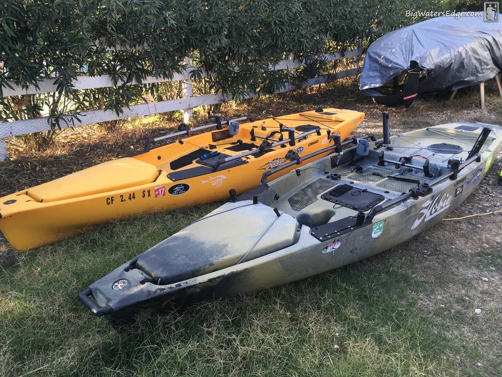 The changes to the new PA are kind of subtle but good. Hobie has added 2 risers and an extra steering handle to the package...so now you can steer from both sides easily. The mounting boards have been changed to include a track system and there are some slots for knives or pliers on the edge as well as indentations for drilling places to mount other plates. They have added an extra piece of weatherstrip on the hatch to help keep it water proof. The graphics are different and bigger...I think they look cool and the new camo finish is really nice. I have one of the new Marine Mat kits that Hobie is now offering but I'm not sure I want to cover that great camo finish...I'll probably use it for my yellow PA 14. This new Marine Mat material is very similar to the Sea Dek pads but less expensive and just as nice looking. The Lowrance ready transducer cover has a few slots added to get rid of mud or sand. Hobie has added strips of reflective tape on the pedal shafts and on the seat. The Mirage drive has the new rounded peddle shafts with the push button adjustment...The pads on the Mirage Drive are camo as well as the pads on the floor of the yak too. The paddle is still the two piece with the t handle included...but it is now longer at 8' 6" and there is another paddle holder clip across from the original one at the front side of the tank well...so now it's easy to carry both parts of the paddle on the PA. That's about it on the changes...What A Comfortable Kayak...That Vantage seat is the best...!!! Anybody looking for a Tandem Island in perfect condition...? Thanks Hobie...!!!! ![]() ![]()